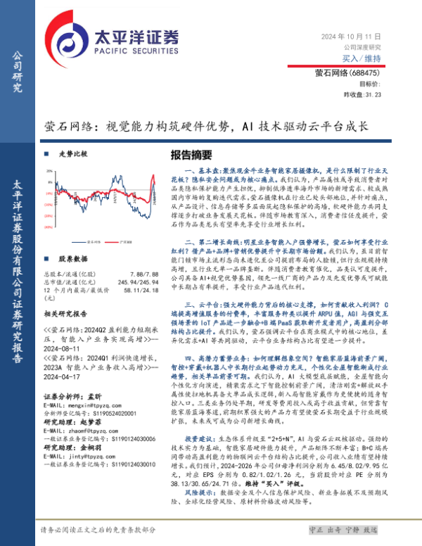 【太平洋证券】【20241011】萤石网络(688475)视觉能力构筑硬件优势,AI技术驱动云平台成长-42页