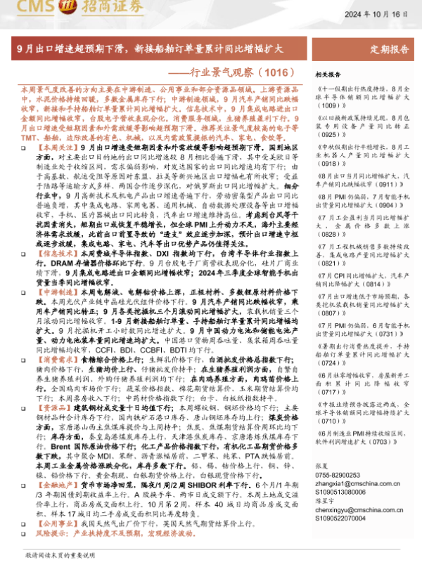 【海通证券】【20241016】行业景气观察(1016) 9月出口增速超预期下滑,新接船舶订单量累计同比增幅扩大-36页