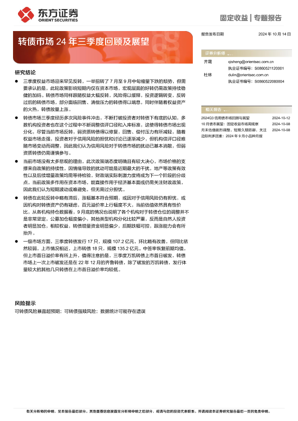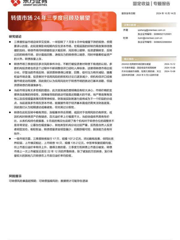 【东方证券】【20241014】转债市场24年三季度回顾及展望-12页