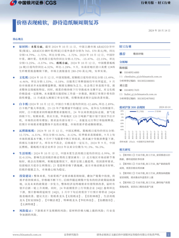【银河证券】【20241014】轻工行业月报:价格表现疲软,静待造纸顺周期复苏-23页