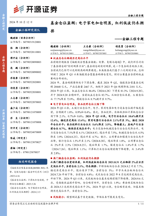 【开源证券】【20241012】金融工程专题-基金仓位监测:电子家电加仓明显,红利低波仍未拥挤-11页