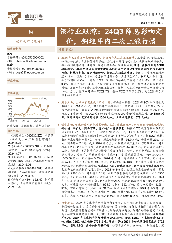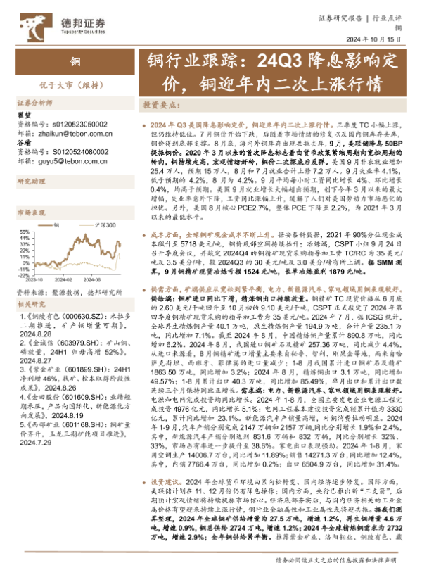 【德邦证券】【20241015】铜行业跟踪:24Q3降息影响定价,铜迎年内二次上涨行情-13页