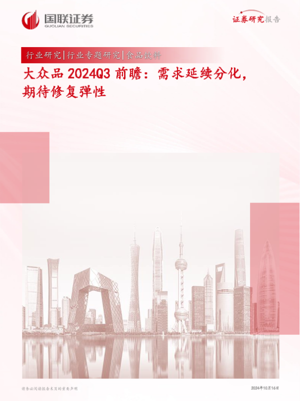 【国联证券】【20241016】食品饮料行业大众品2024Q3前瞻:需求延续分化,期待修复弹性-16页