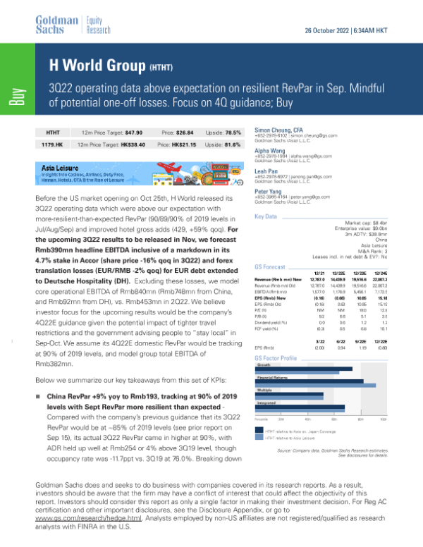 【Goldman Sachs】【20221026】关于H World Group 3Q22经营数据超出预期及RevPar弹性的报告-12页