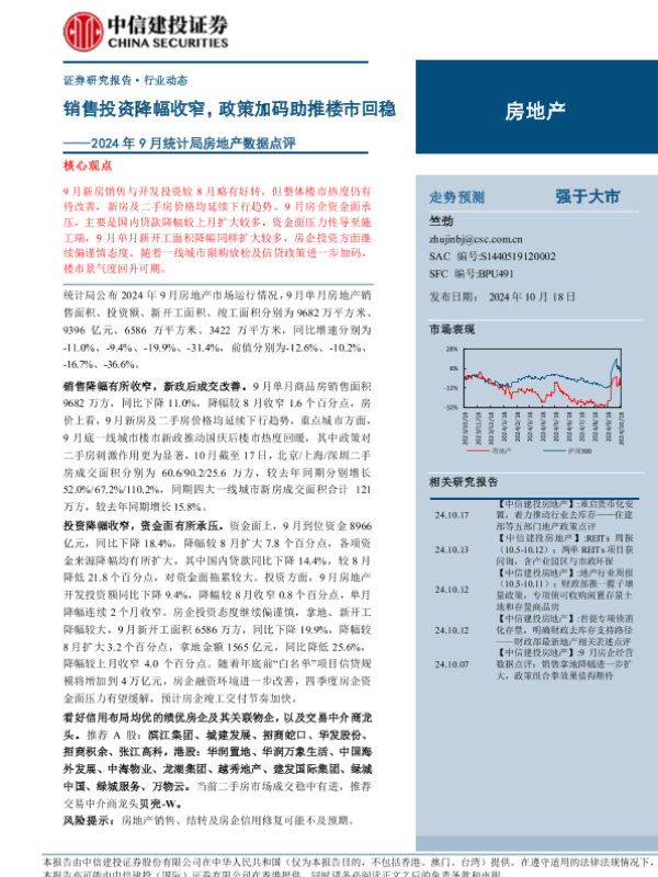 【中信建投证券】【20241018】2024年9月统计局房地产行业数据点评:销售投资降幅收窄,政策加码助推楼市回稳-10页