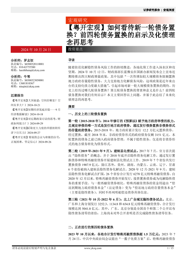 【粤开证券】【20241024】【粤开宏观】如何看待新一轮债务置换?前四轮债务置换的启示及化债理念再思考-19页