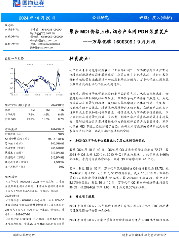 【国海证券】【20241020】万华化学(600309)9月月报:聚合MDI价格上涨,烟台产业园PDH装置复产-34页