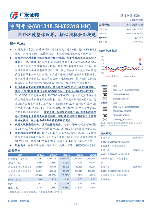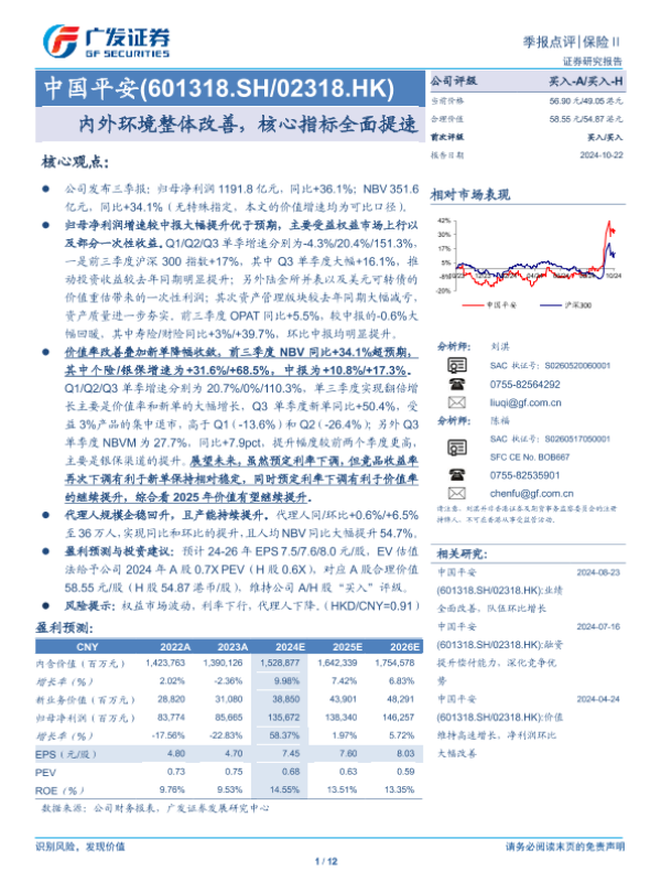 【广发证券】【20241022】中国平安(601318)内外环境整体改善,核心指标全面提速-12页