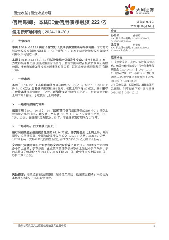 【天风证券】【20241020】信用债市场回顾:信用跟踪,本周非金信用债净融资222亿-19页