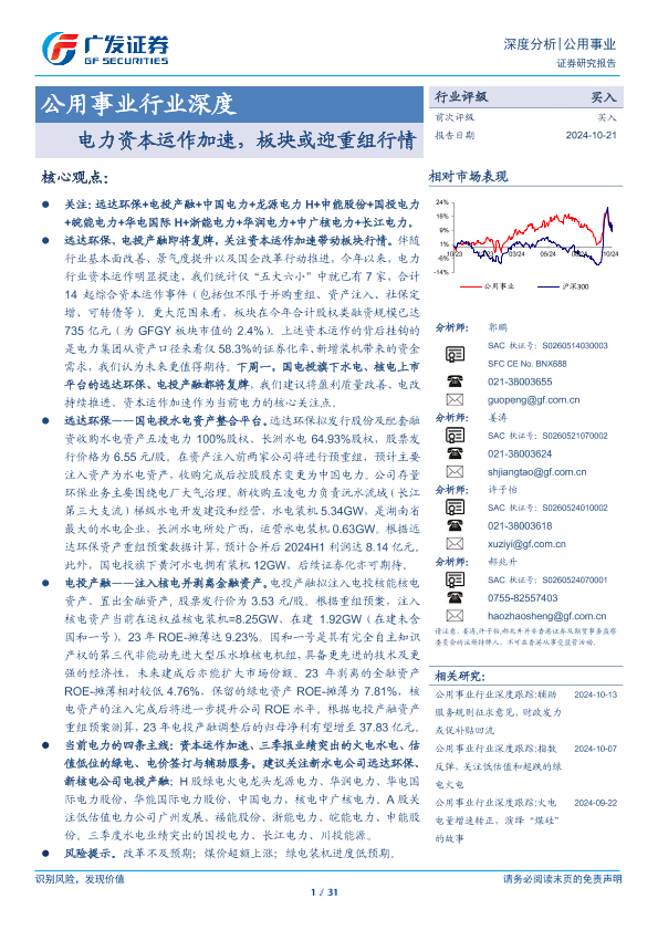 【广发证券】【20241021】公用事业行业深度:电力资本运作加速,板块或迎重组行情-31页