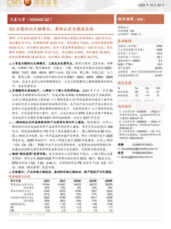 【海通证券】【20241022】卫星化学(002648)Q3业绩环比大幅增长,看好公司长期成长性-16页