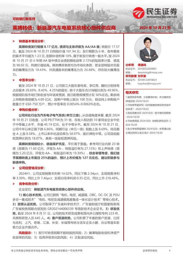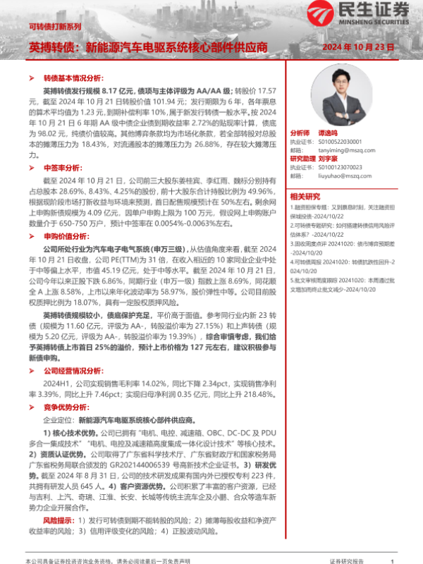 【民生证券】【20241023】可转债打新系列-英搏转债:新能源汽车电驱系统核心部件供应商-15页