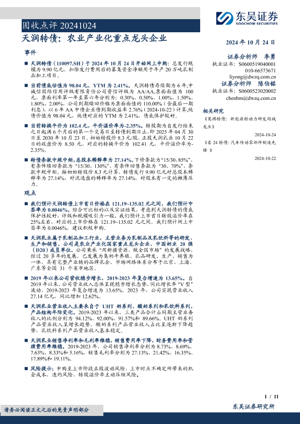 【东吴证券】【20241024】固收点评:天润转债,农业产业化重点龙头企业-11页