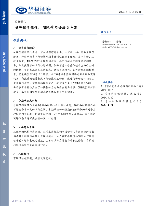 【华福证券】【20241020】固收量化:趋势信号谨慎,期限模型偏好5年期-16页