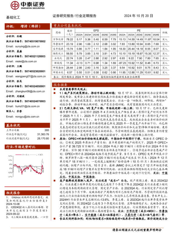 【中泰证券】【20241020】基础化工行业:地产增量政策频出;巴斯夫延迟复产或开启维生素新一轮上涨-27页
