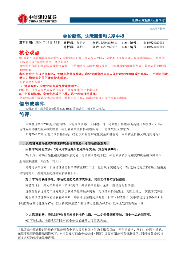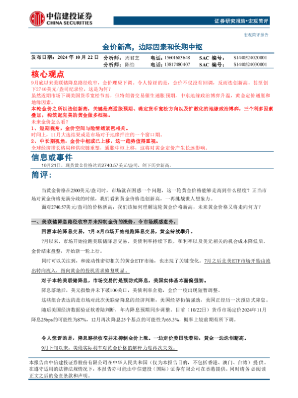 【中信建投证券】【20241022】宏观简评:金价新高,边际因素和长期中枢-10页