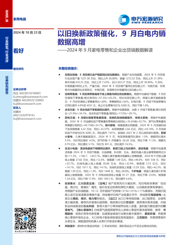 【申万宏源】【20241023】家用电器行业2024年9月家电零售和企业出货端数据解读:以旧换新政策催化,9月白电内销数据高增-15页