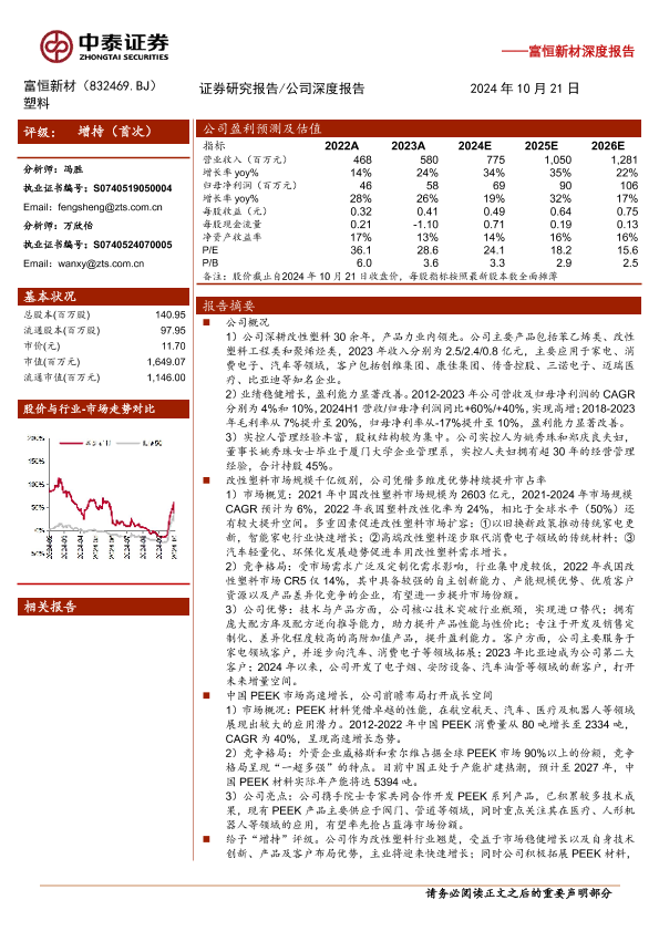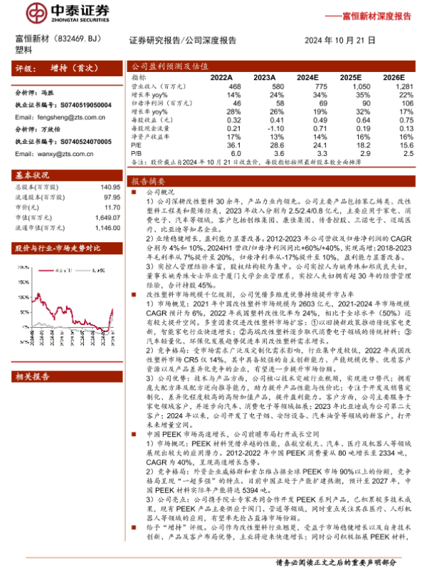 【中泰证券】【20241021】富恒新材(832469)深度报告:改性塑料翘楚布局PEEK,业绩增长确定性强-26页