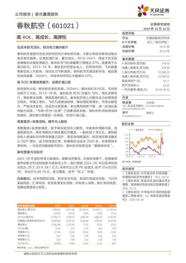【天风证券】【20241022】春秋航空(601021)高ROE、高成长、高弹性-17页