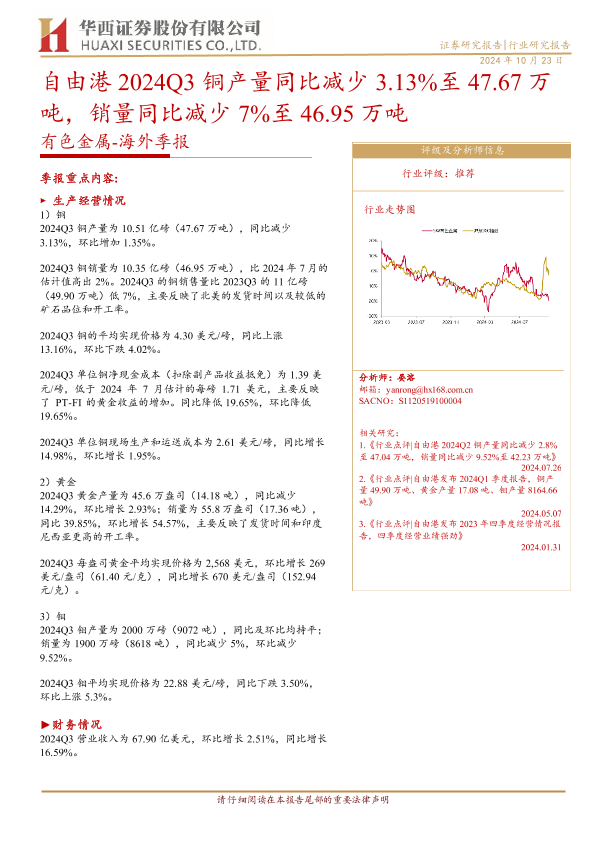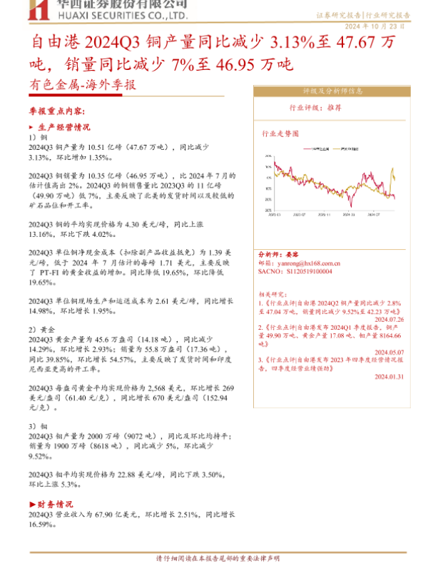 【华西证券】【20241023】金属行业-海外季报:自由港2024Q3铜产量同比减少3.13%至47.67万吨,销量同比减少7%至46.95万吨-11页