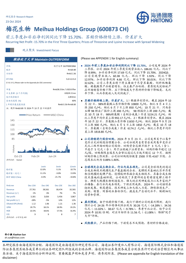 【海通国际】【20241023】梅花生物(600873)前三季度扣非后净利润同比下降15.70%,苏赖价格持续上涨,价差扩大-13页