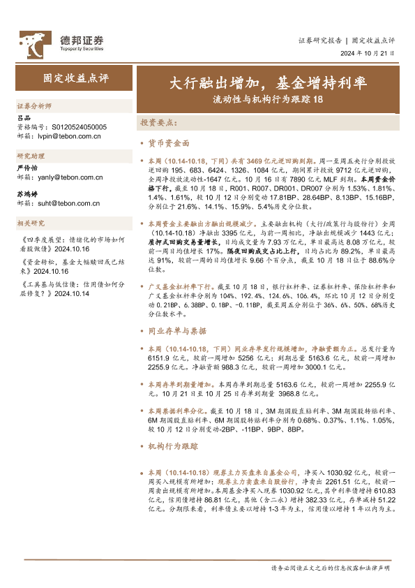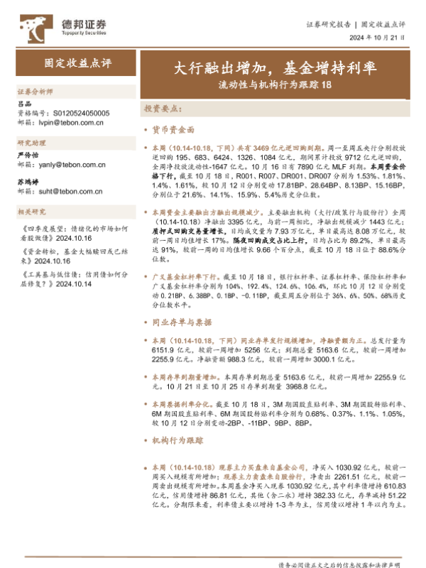 【德邦证券】【20241021】流动性与机构行为跟踪18:大行融出增加,基金增持利率-19页