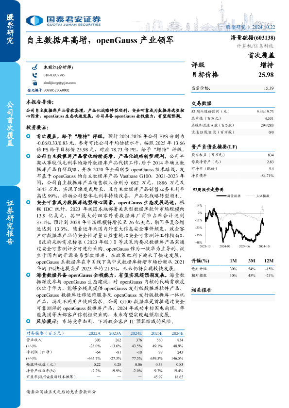 【国泰君安证券】【20241022】海量数据(603138)自主数据库高增,openGauss产业领军-17页