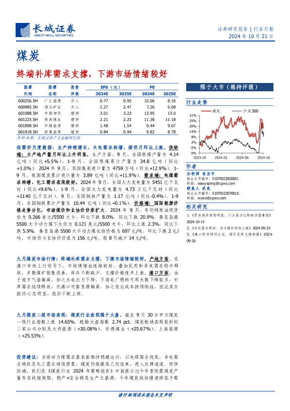 【长城证券】【20241021】煤炭行业月报:终端补库需求支撑,下游市场情绪较好-13页