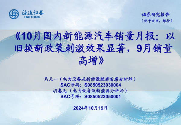 【海通证券】【20241019】10月国内新能源汽车销量月报:以旧换新政策刺激效果显著,9月销量高增-22页