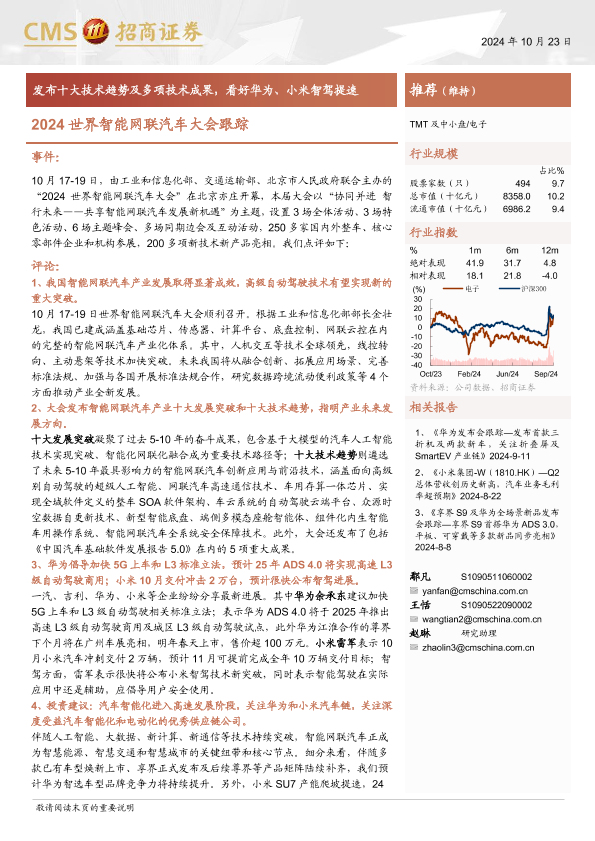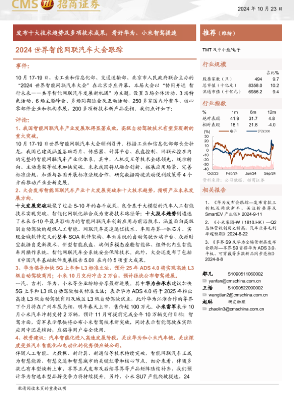 【海通证券】【20241023】电子行业2024世界智能网联汽车大会跟踪:发布十大技术趋势及多项技术成果,看好华为、小米智驾提速-11页