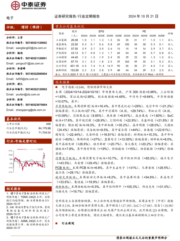 【中泰证券】【20241021】电子行业:情绪助推板块集体大涨,Q3业绩披露期关注高增方向-14页