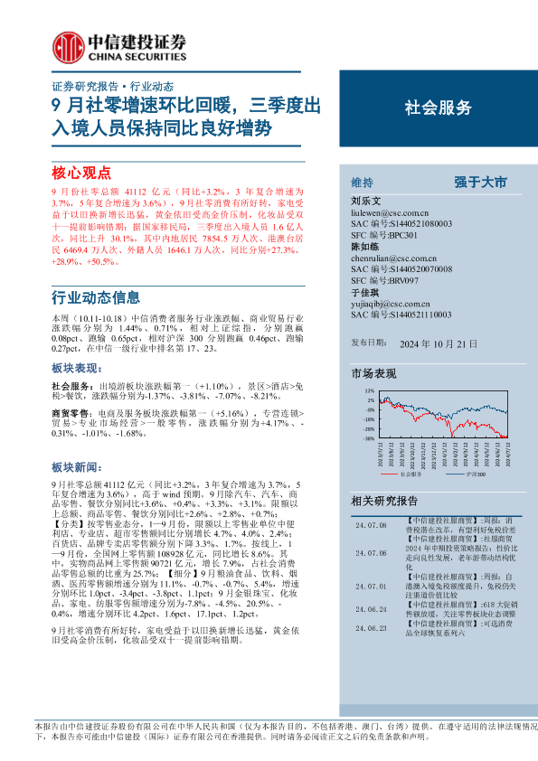 【中信建投证券】【20241021】社会服务行业:9月社零增速环比回暖,三季度出入境人员保持同比良好增势-26页