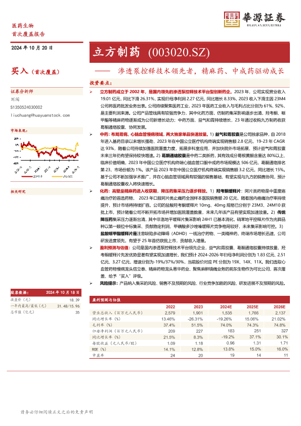 【华源证券】【20241020】立方制药(003020)渗透泵控释技术领先者,精麻药、中成药驱动成长-24页