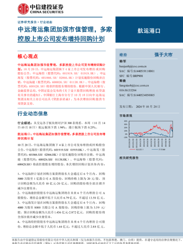 【中信建投证券】【20241020】航运港口行业动态:中远海运集团加强市值管理,多家控股上市公司发布增持回购计划-22页