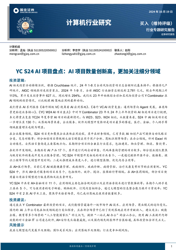 【国金证券】【20241019】计算机行业YC+S24+AI项目盘点:AI项目数量创新高,更加关注细分领域-20页