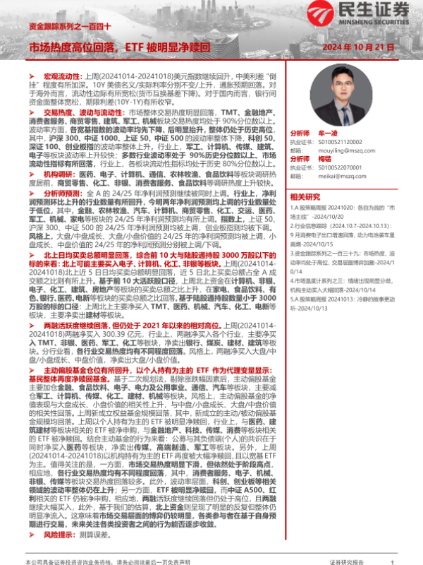 【民生证券】【20241021】资金跟踪系列之一百四十:市场热度高位回落,ETF被明显净赎回-34页