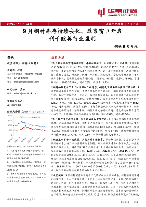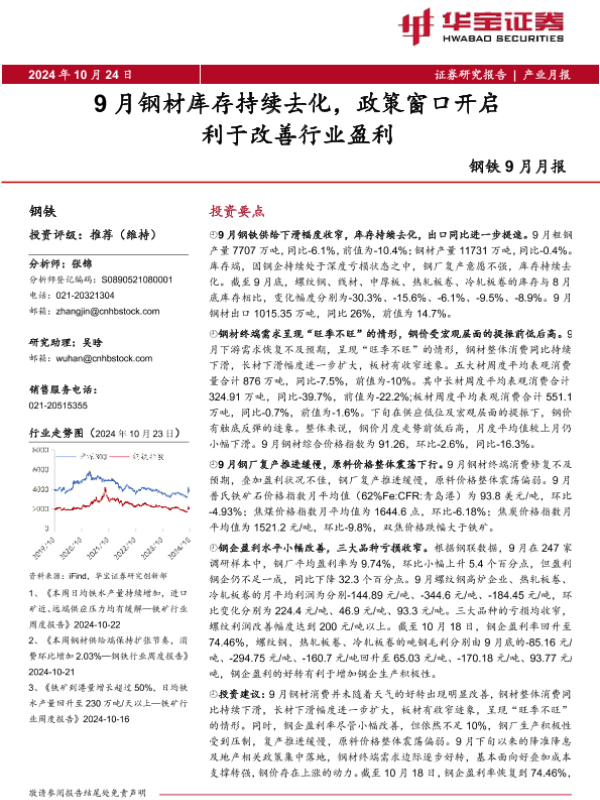 【华宝证券】【20241024】钢铁行业9月月报:9月钢材库存持续去化,政策窗口开启利于改善行业盈利-19页