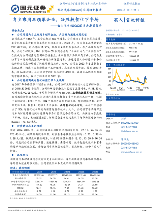 【国元证券】【20241021】长安汽车(000625)首次覆盖报告:自主乘用车领军企业,决胜数智化下半场-36页