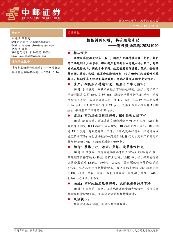 【中邮证券】【20241020】高频数据跟踪:钢铁持续回暖,物价继续走弱-13页