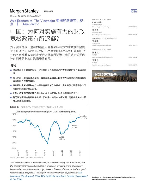 【Morgan Stanley】【20241008】亚洲经济研究:观点 中国:为何对实施有力的财政宽松政策有所迟疑?-11页