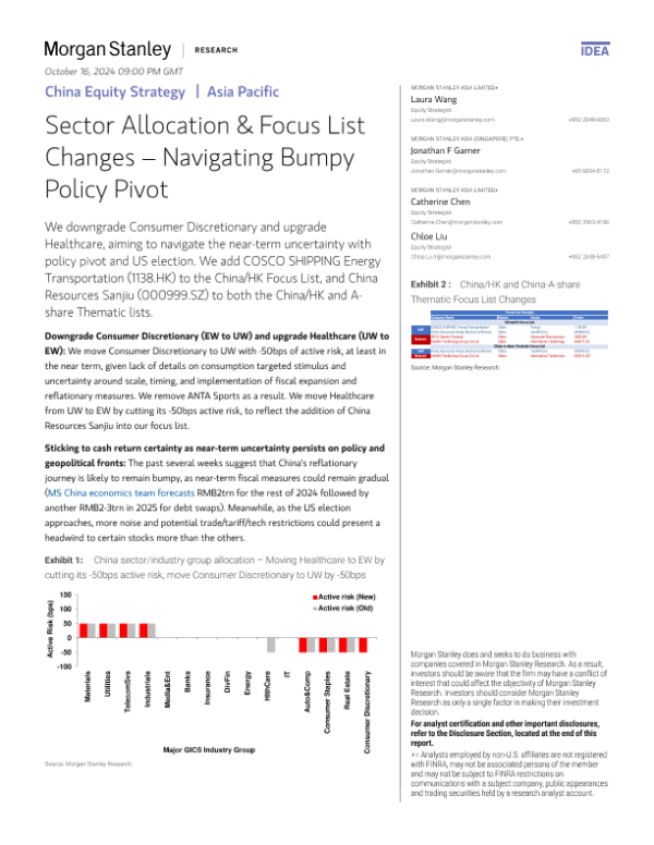 【Morgan Stanley】【2024】nley-China Equity Strategy Sector Allocation & Focus List Changes – Navigating Bumpy Policy Pivot-9页