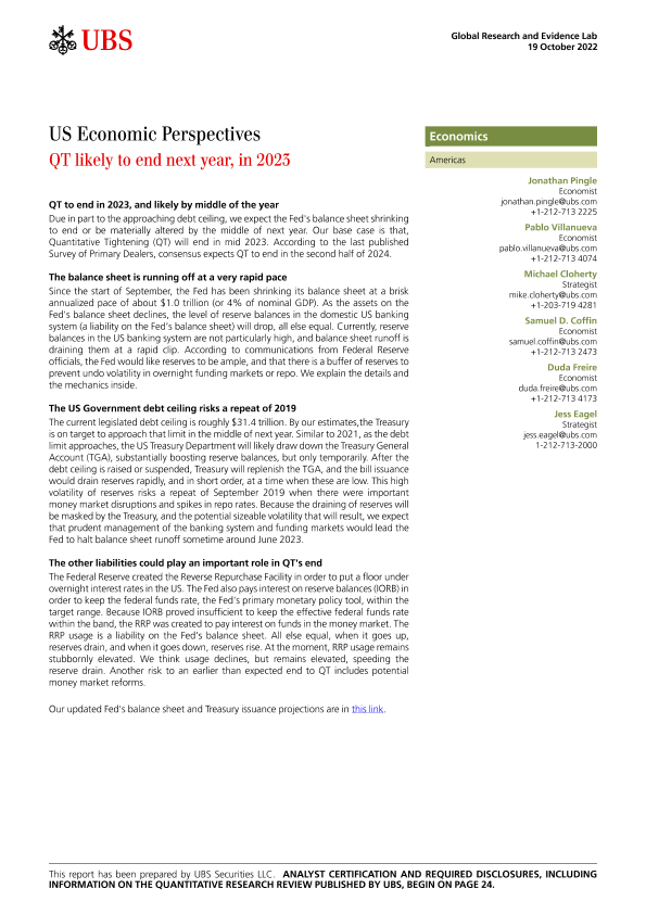 【UBS Securities LLC】【20221019】US Economic Perspectives QT likely to end next year, in 2023-27页