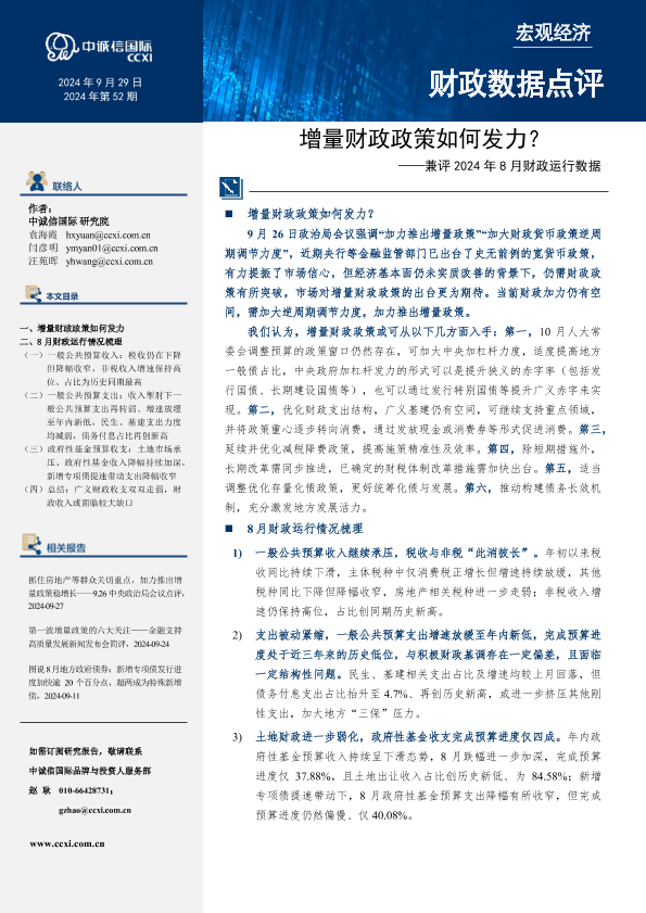 【中诚信国际】【20240929】增量财政政策如何发力?——兼评2024年8月财政运行数据-12页