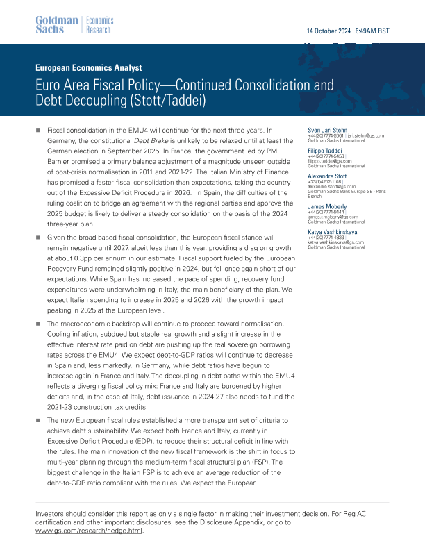 【Goldman Sachs】【20241014】投行报告-欧洲经济分析师:欧元区财政政策——持续巩固和债务脱钩-11页