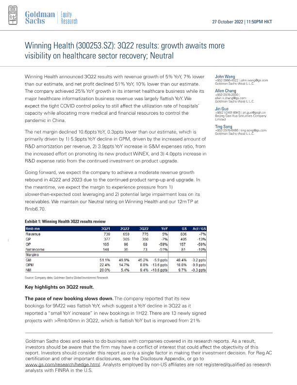 【Goldman Sachs】【20221027】Winning Health 3Q22 results growth awaits more visibility on healthcare sector recovery; Neutral-8页