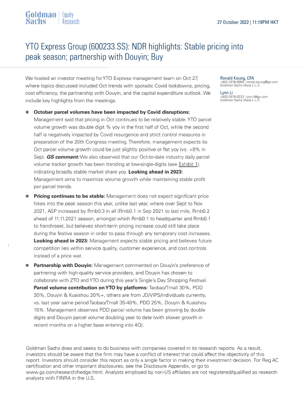 【Goldman Sachs】【20221027】YTO Express Group NDR highlights Stable pricing into peak season; partnership with Douyin; Buy-9页