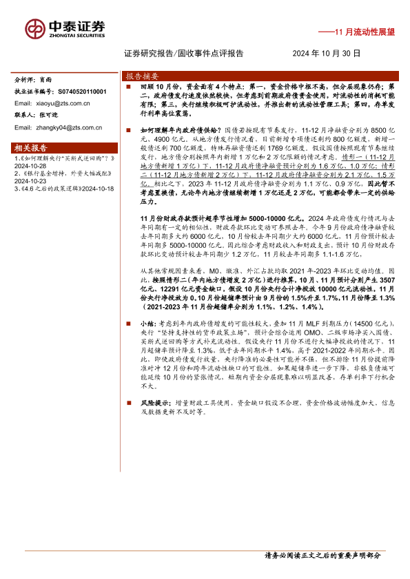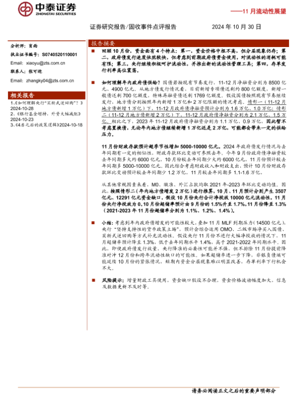 【中泰证券】【20241030】11月流动性展望:如果供给放量,11月资金面怎么看?-12页