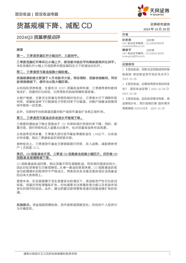 【天风证券】【20241029】2024Q3货基季报点评:货基规模下降、减配CD-10页