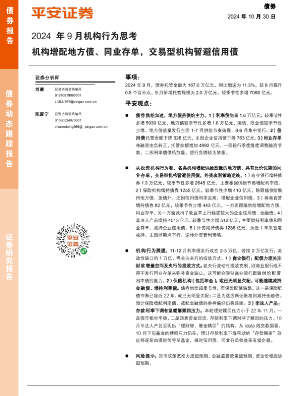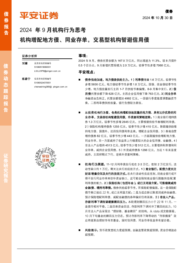 【平安证券】【20241030】2024年9月机构行为思考:机构增配地方债、同业存单,交易型机构暂避信用债-10页