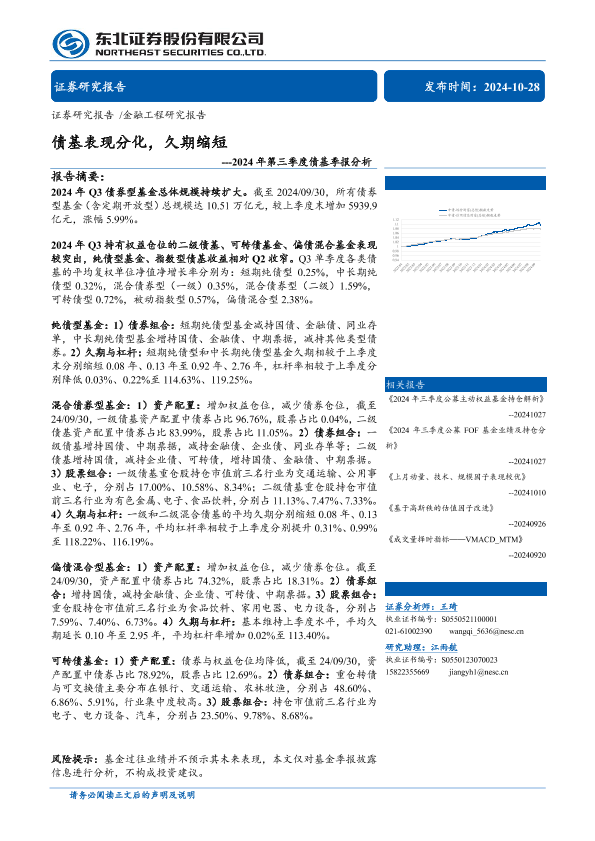 【东北证券】【20241028】2024年第三季度债基季报分析:债基表现分化,久期缩短-37页